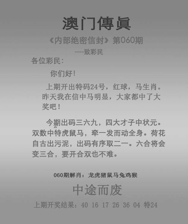 060期:澳门传真四字解开?00 【前程万里】 解:前程万里,解肖:鼠虎牛龙狗马 ============================ 059期:澳门传真四字解开鸡10 【两袖清风】 解:两袖清风,解肖:鸡狗马鼠虎牛 ============================ 058期:澳门传真四字解开鼠31 【两袖清风】 解:两袖清风,解肖:鸡狗马鼠虎牛 ============================ |