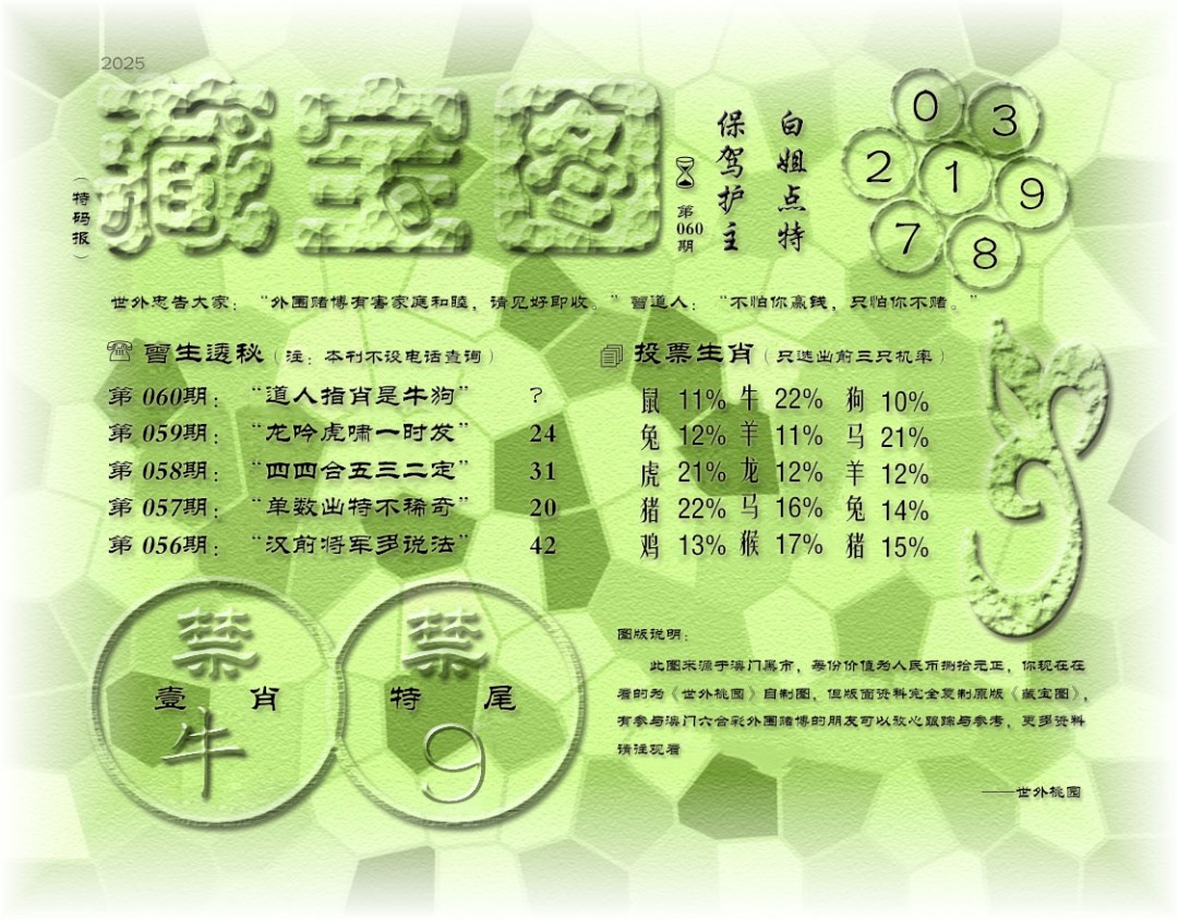 060期:澳门老版藏宝图解开?00 【今期土木生肖头】 解:今期土木生肖头,解:马鼠牛猴虎狗 ============================ 059期:澳门老版藏宝图解开鸡10 【秀才元帅找杏花】 解:秀才元帅找杏花,解:猴虎狗马鸡牛 ============================ 058期:澳门老版藏宝图解开鼠31 【四三三七带六来】 解:四三三七带六来,解:马鸡牛鼠虎狗 ============================ |